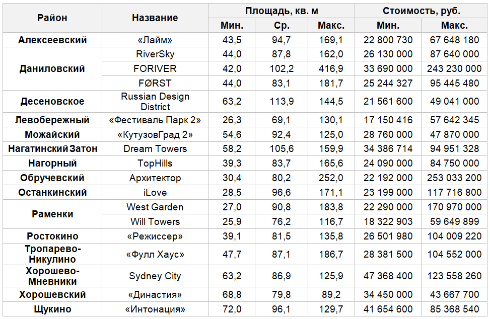 Самая большая средняя площадь квартир в продаже — в жилом комплексе Dream Towers — 105,6 кв. м. Минимальная площадь квартиры в ЖК — 58,2 кв. м. Это однокомнатный лот по цене 34,3 млн руб. Максимальная площадь — 159,9 кв. м, представлена пятикомнатной квартирой по цене 94 951 328 руб. Жилой комплекс Dream Towers расположен в Нагатинской пойме (район Нагатинский Затон), в 4 минутах пешком от парка развлечений «Остров мечты». Комплекс полностью построен и введён в эксплуатацию.