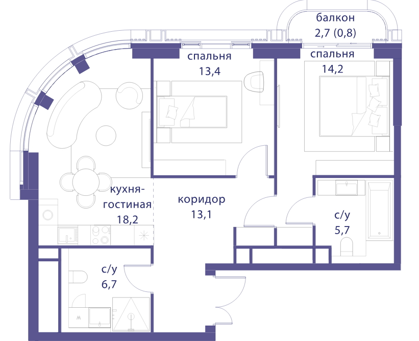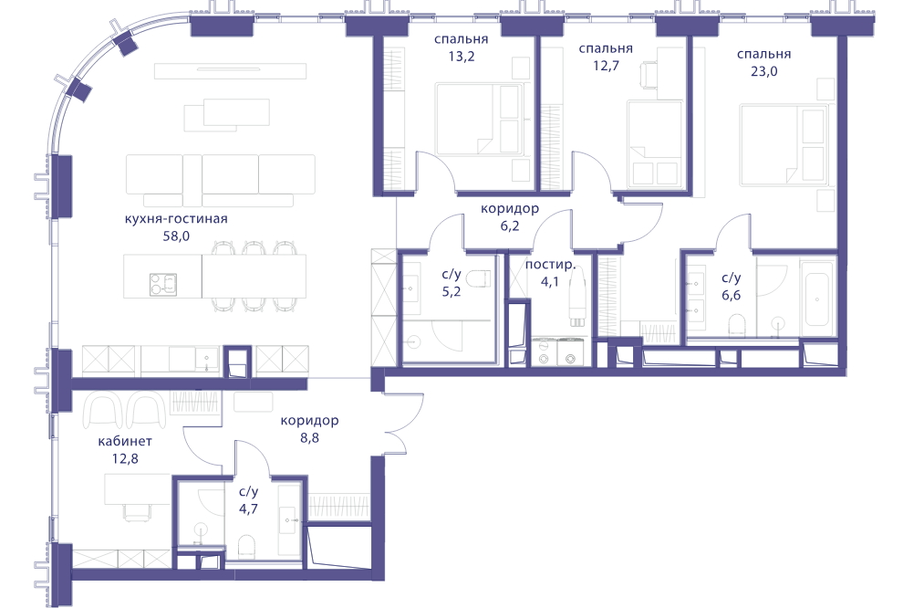 Планировки трёх- и четырёхкомнатных совершенно нетипичные, благодаря округлой форме корпусов внутри помещения такие же плавные, с изогнутыми панорамными окнами в кухнях-гостиных.